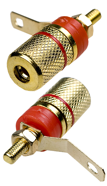 1-663G, гнездо банан 28мм пластик на корпус красный кабель до 6мм позол.